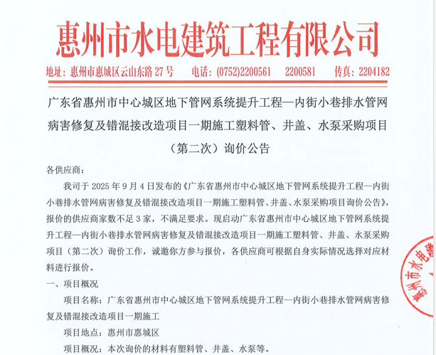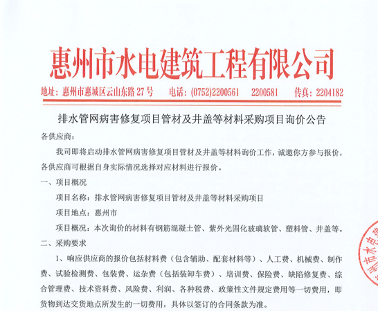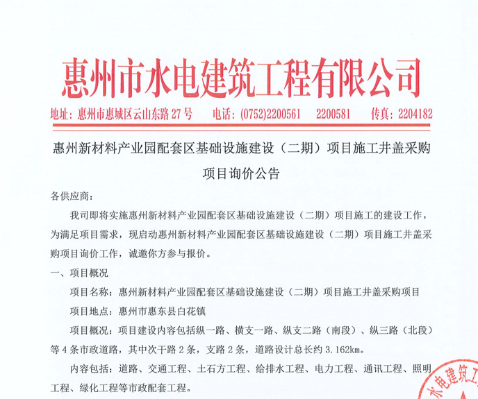 惠州新材料產業園配套區基礎設施建設(二期)項目施工井蓋采購項目詢價公告……
